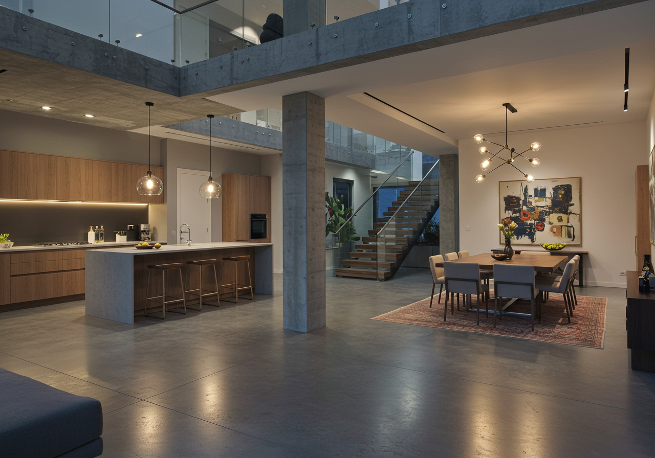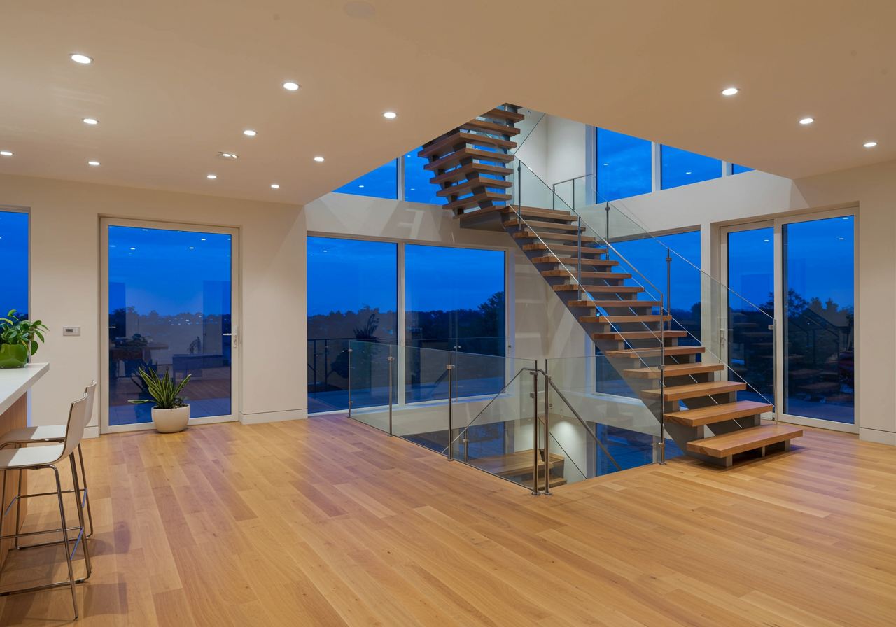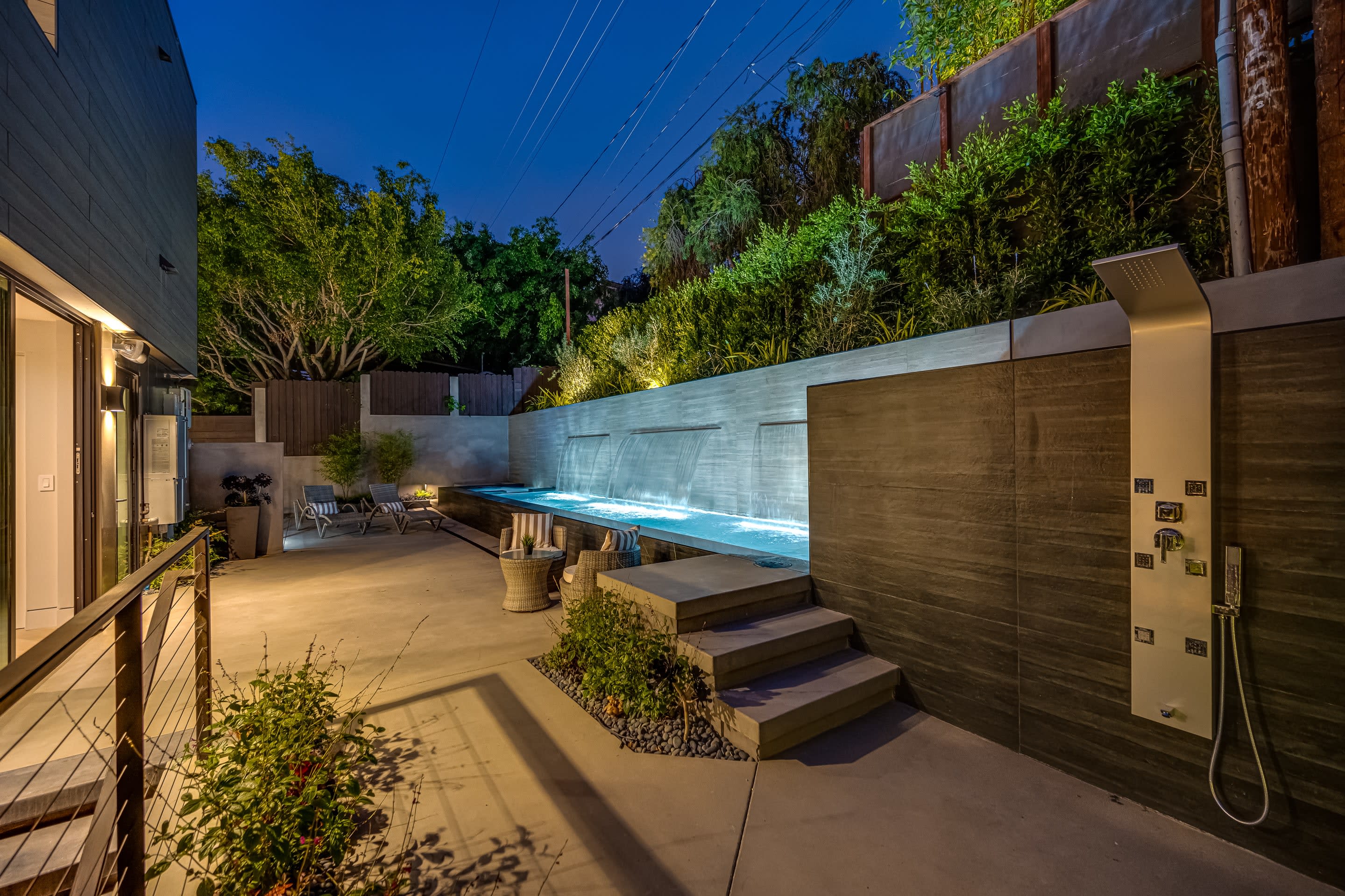 Masterfully designed by Joe Flynn, AIA, of Flynn Architects, each square inch of the open floor plan was carefully considered. This home offers every modern luxury yet grounds itself in classic, natural architectural elements such as custom concrete walls, soaring airy ceilings, raw steel beams, oversized windows and skylights, clear glass railings promoting visual flow from room to room, floors made of polished concrete, Italian tile and wide-plank hardwood flooring, waterfalls pouring into the crystal blue lap pool, lush and fruitful landscaping, and warm LED lighting.