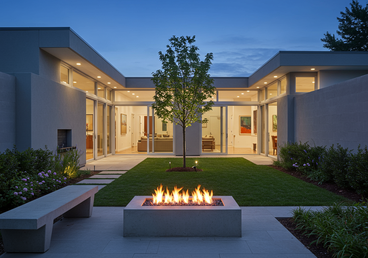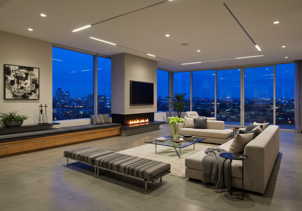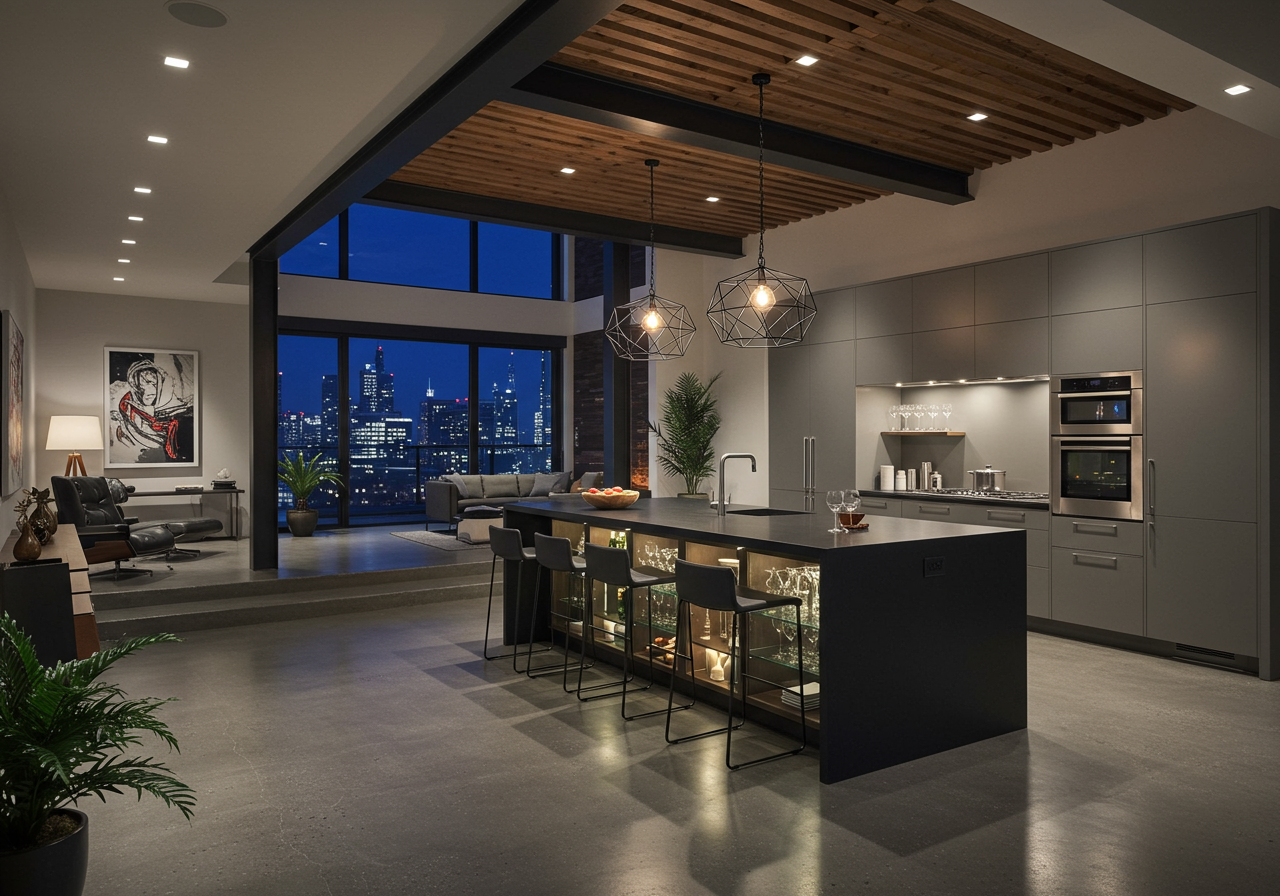 Masterfully designed by Joe Flynn, AIA, of Flynn Architects, each square inch of the open floor plan was carefully considered. This home offers every modern luxury yet grounds itself in classic, natural architectural elements such as custom concrete walls, soaring airy ceilings, raw steel beams, oversized windows and skylights, clear glass railings promoting visual flow from room to room, floors made of polished concrete, Italian tile and wide-plank hardwood flooring, waterfalls pouring into the crystal blue lap pool, lush and fruitful landscaping, and warm LED lighting.