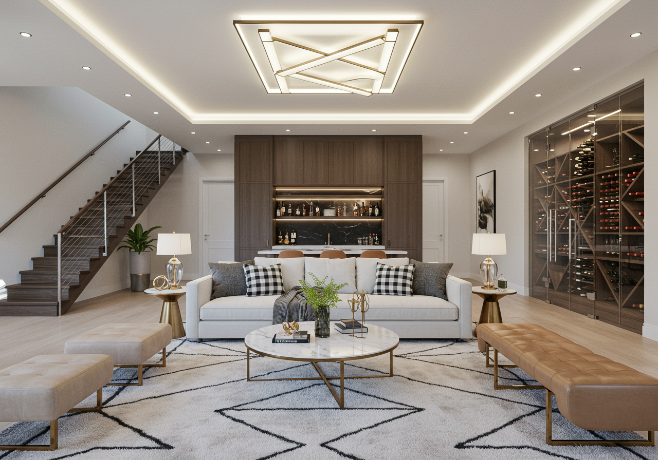 If you crave a cozy movie night in, head below the main floor to the fantastic media room with Marantz surround sound system, a custom wet bar, and a visually stunning glass-enclosed wine cellar with a tasting bar. You’ll also find beautiful bedrooms, full bathrooms with custom tiling offering a brilliant contrast to the black fixtures, as well as a laundry room with doggie shower and laundry chute return.