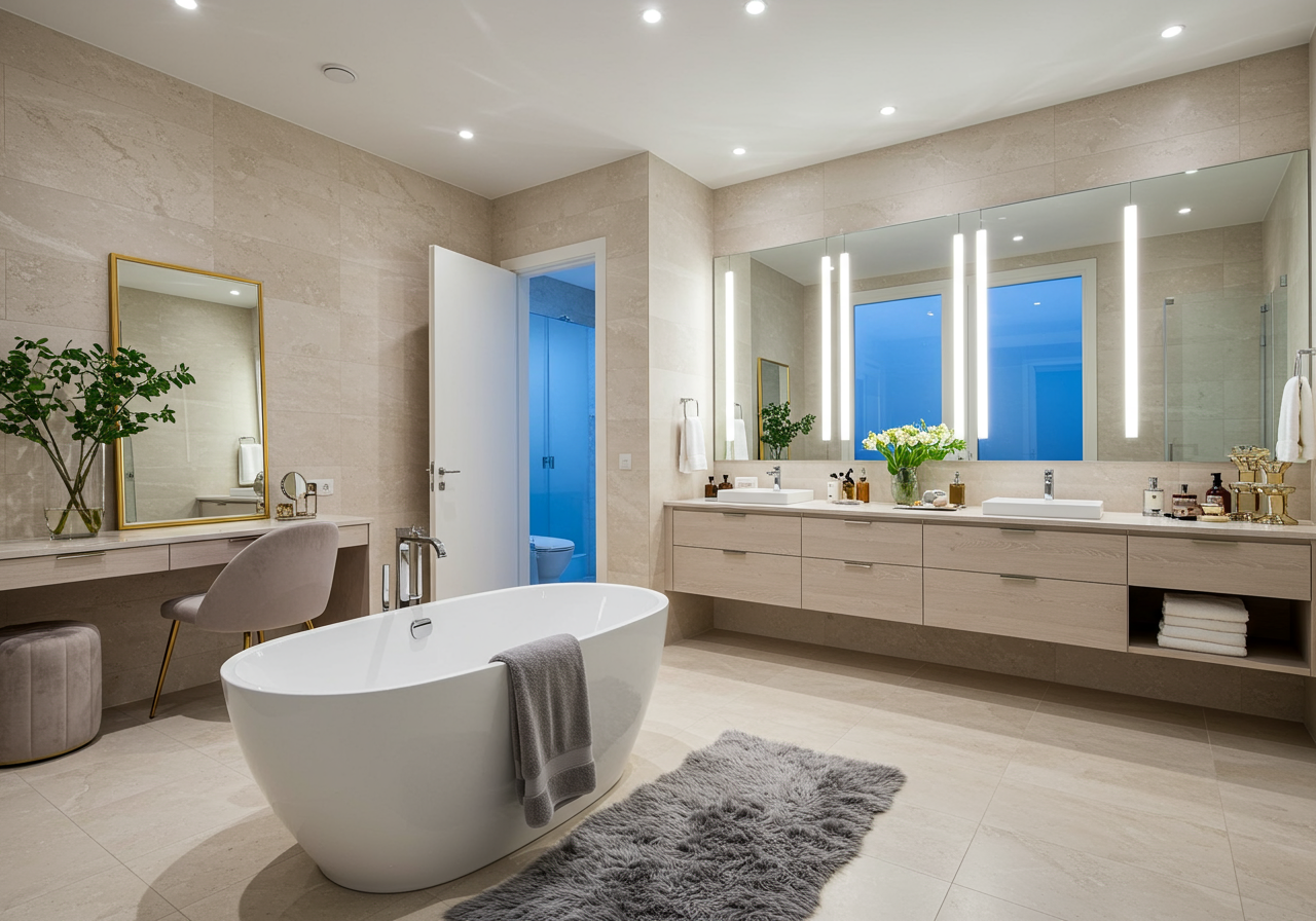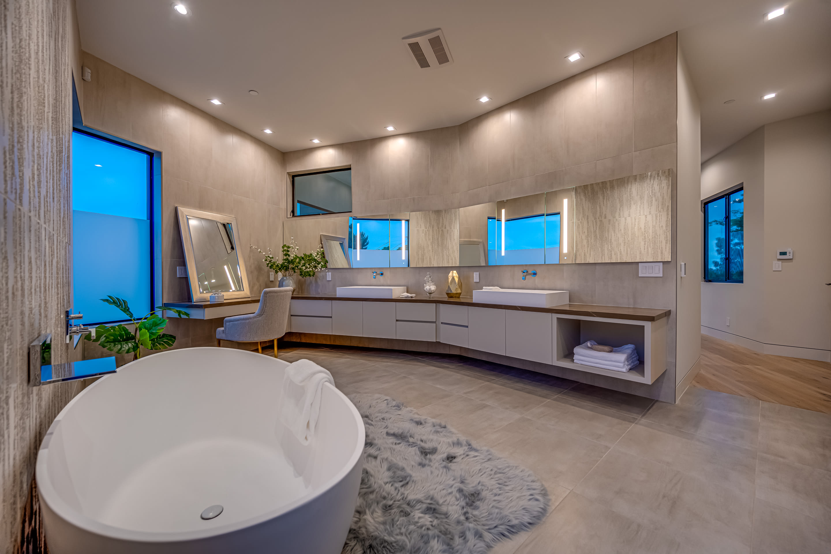 The master bathroom is complete with marble countertops, custom Italian tile, radiant floor heating, dual walk-in steam shower, and soaking tub for ultimate relaxation.