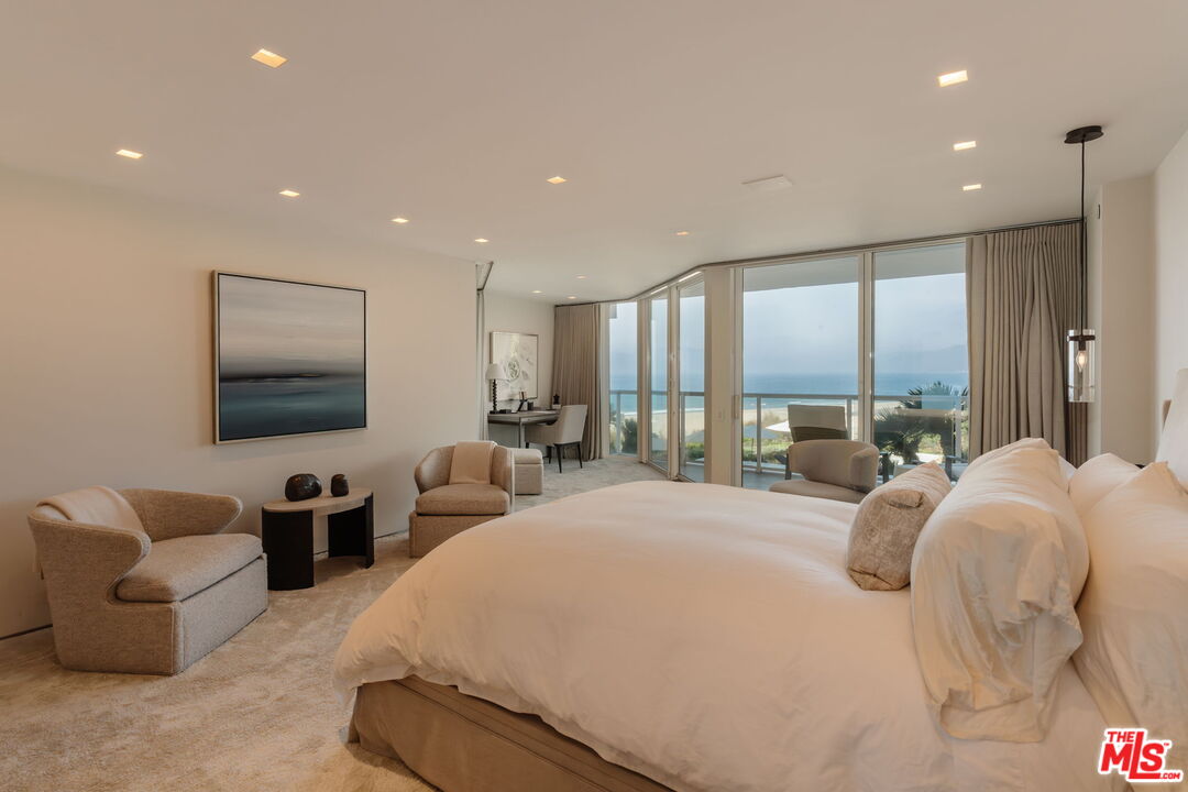 Perched above the Pacific in Santa Monica's most prestigious oceanfront address, 101 Ocean, this extraordinary three-bedroom, three-bath residence has been reimagined in collaboration with Abramson Architects and Concept Design. Spanning nearly 3,000 square feet on a single level, the home embodies the elegance of a five-star resort, blending hand-selected designer finishes, sculptural lighting, and seamless indoor-outdoor living with panoramic views of the coastline, ocean, and Santa Monica Mountains. Walls of glass flood the interiors with natural light and extend to a generous ocean-view terrace, ideal for sunset lounging or al fresco dining. A striking Rift Oak feature wall anchors the living room, while a sleek stone-topped bar creates a sophisticated space for entertaining. The dining area, illuminated by a chandelier from A. Rudin, flows effortlessly into a chef's kitchen outfitted with Wolf and Miele appliances, slab-stone surfaces, temperature-controlled wine storage, and a built-in banquette for relaxed gatherings. Throughout the residence, statement lighting by Apparatus, Paul Ferrante, and Holly Hunt infuses each room with an artful glow, while Crestron home automation elevates modern convenience. The primary suite is a private sanctuary, complete with its own ocean-facing balcony, dual walk-in closets, and a luxurious ensuite with a custom-fabricated travertine shower and a freestanding soaking tub. Two additional bedrooms are designed with custom millwork by Swiss WoodWorking and open to a serene patio--one is appointed with a Porcelanosa-clad ensuite bath, while the other offers versatility with a concealed murphy bed, ideal as a media lounge, office, or guest retreat. Direct elevator access, artisanal stonework by Olympic Tile & Stone, and finely crafted details throughout further underscore the residence's sophistication. Within the exclusive enclave of 101 Ocean, residents enjoy a private resort environment complete with 24-hour doorman and security, along with direct beach access via an underground tunnel. Exceptional amenities include a sky lounge, ocean-view sundeck with a swimmer's pool, spa, and an outdoor kitchen with a shaded dining pavilion. Lushly landscaped courtyards lead to state-of-the-art fitness and yoga facilities, organic gardens, and a dog run. All of this is set just moments from Montana Avenue's boutiques, the Third Street Promenade, and a short coastal drive to Malibu--making this home a rare opportunity to experience Santa Monica's most refined oceanfront lifestyle.