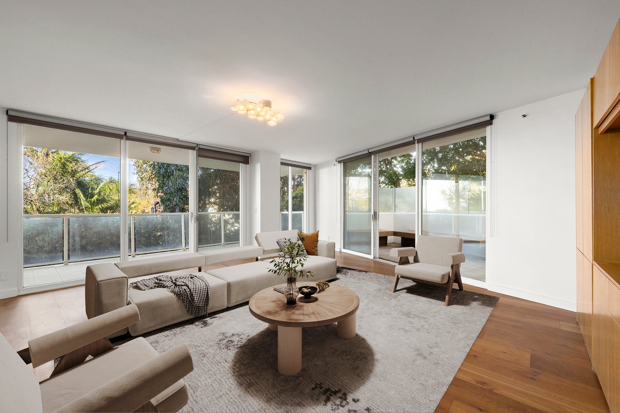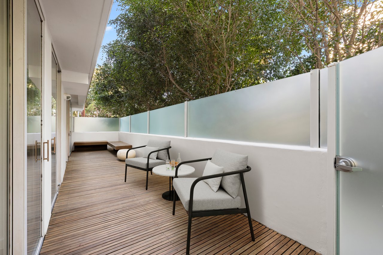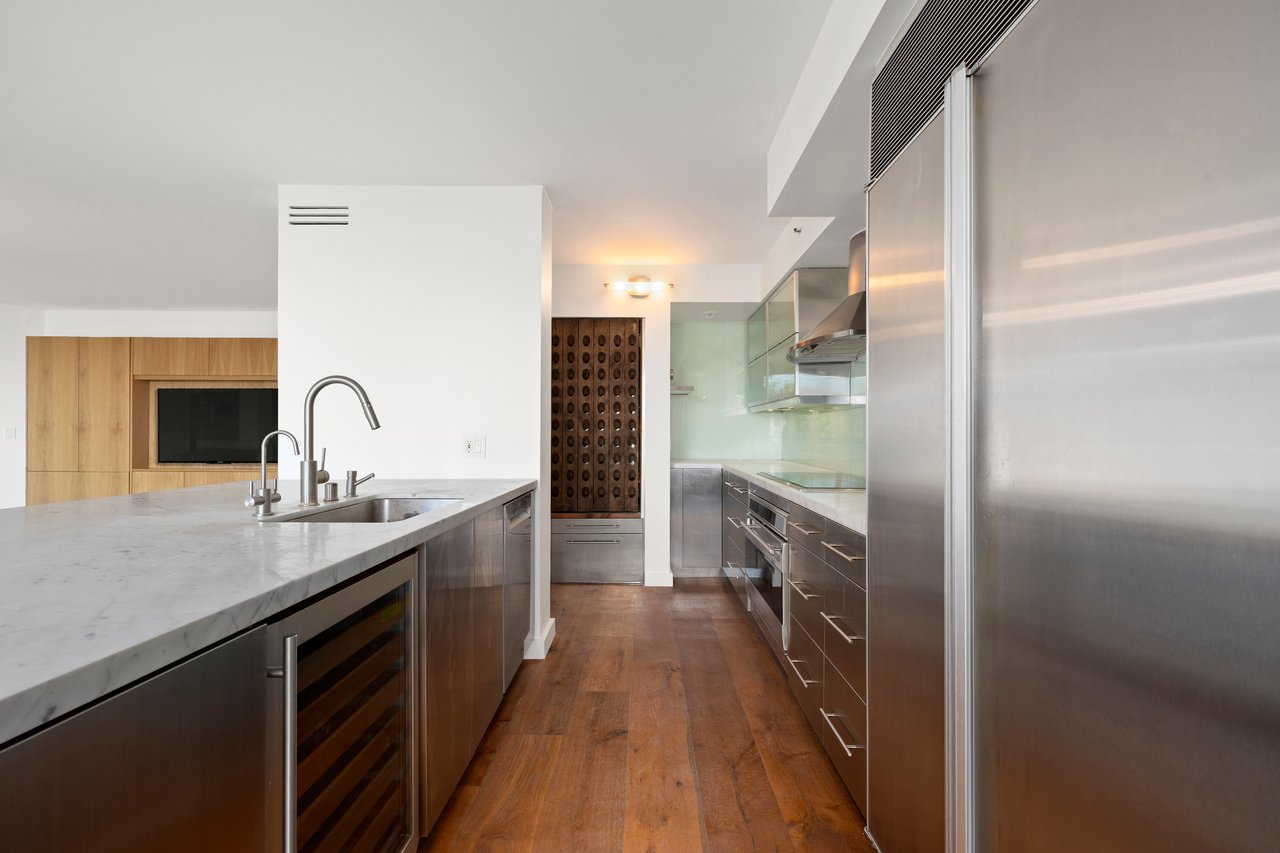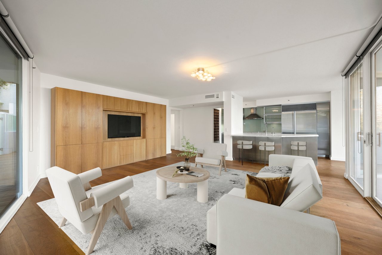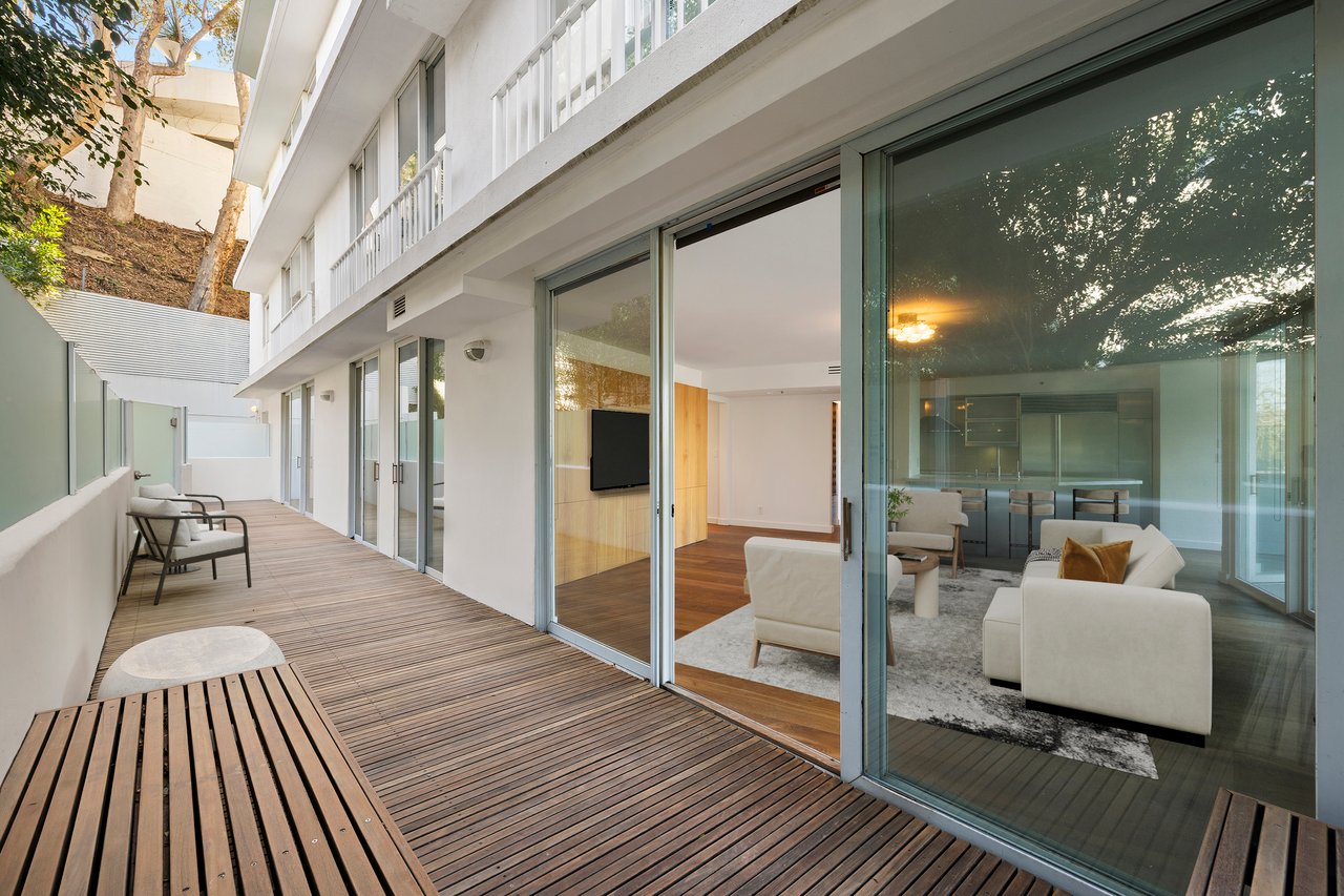 Experience the pinnacle of modern coastal living in this custom 2-bedroom, 2-bathroom residence at 101 Ocean Ave, one of Santa Monica's most iconic buildings. Framed by ocean views and lush verdant surroundings, floor-to-ceiling windows throughout create a serene, garden-like atmosphere that feels worlds away from the city while remaining steps from the sand. The generously scaled living and kitchen combination is anchored by bespoke built-ins, custom glass cabinetry, and a kitchen featuring marble countertops, wine display, and slab stone island. No unit in the building offers more outdoor entertaining space than this one, combining a front balcony with ocean views, and a sprawling east-side patio complete with built-in seating, making it an exceptional setup for hosting or simply enjoying the coastal air. Hardwood floors carry through both bedrooms, each with private deck access. The building is managed by five-star hospitality professionals, and features a 24-hour front desk and freshly reimagined grounds including pool and spa, multiple curated seating areas, an outdoor kitchen with BBQ and pizza oven, a full fitness center, yoga studio, dog park, organic gardens, and a sky lounge with sweeping Pacific views. Steps from the sand and within easy reach of Giorgio Baldi, Golden Bull, Canyon Square, Montana Avenue, and downtown Santa Monica, this is a rare convergence of privacy, craftsmanship, and location.