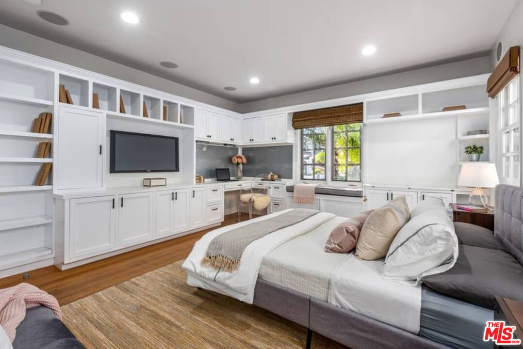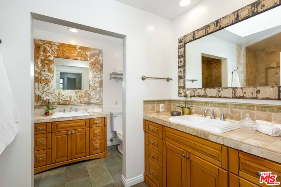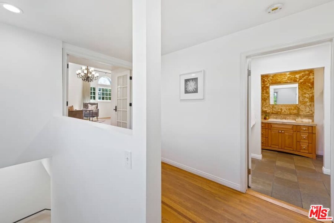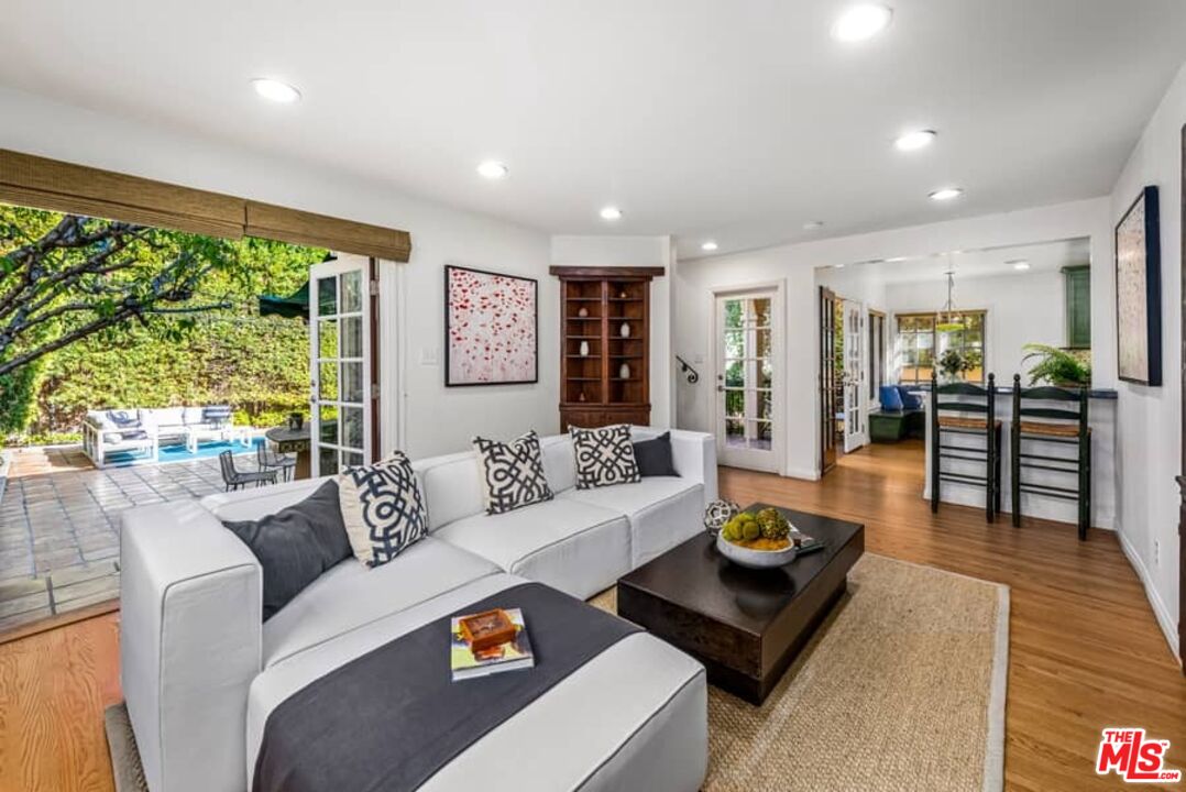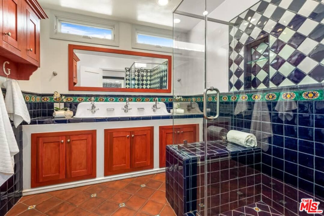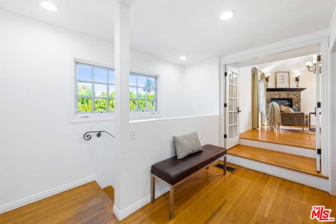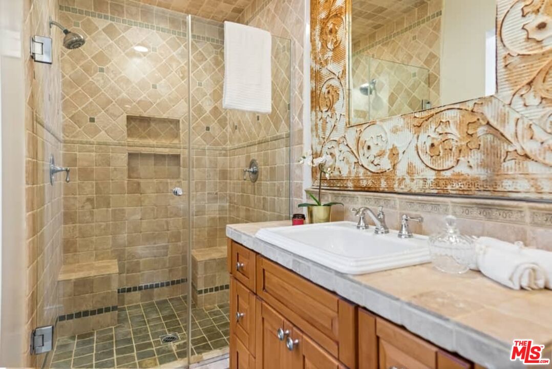 Beautifully updated Santa Barbara Courtyard 4 bed/2.75 bath 2-Story Spanish with incredible thought and detail in design and expanded floor plan, complimenting the unspoiled charm of the original character throughout. Inviting tiled front courtyard with gate opens to living room with dramatic barrel ceiling, chic wood paneled wall, fireplace with original tile design hearth, wood mantel, wall sconces and double French doors opening to front courtyard. Formal dining room with coved soffit ceiling opening to remodeled open sun-filled kitchen with stainless steel appliances including 6-burner Thermador range/oven, updated cabinetry with pantry cabinet and pull out drawers, desk workspace and breakfast nook opening to spacious family room and to the entertainer's backyard with covered back patio with archways and paver tiles to beautifully tiled backyard to create seating areas with outdoor built-in barbecue with counter covered with retractable awning, and gated driveway. 3 bed/1.75 bath downstairs, with 2 of the bedrooms including beautiful built-ins. Upstairs is the primary suite quarters with vaulted ceilings, treetop and Century City views, fireplace, 2nd laundry area, 2 custom-finished closets including a walk-in closet. Beautiful primary bath filled with natural light, dual basins, separate bath and shower and skylight. Additional features include archways, custom tiled bathrooms, hardwood floors, central ac/heat, Laundry area upstairs and downstairs, porte cochere and auto-gated driveway. Close proximity to Westwood Blvd. & Pico Blvd. restaurants and retail, Westfield Century City Mall, UCLA & Beverly Hills. Westwood Charter School.