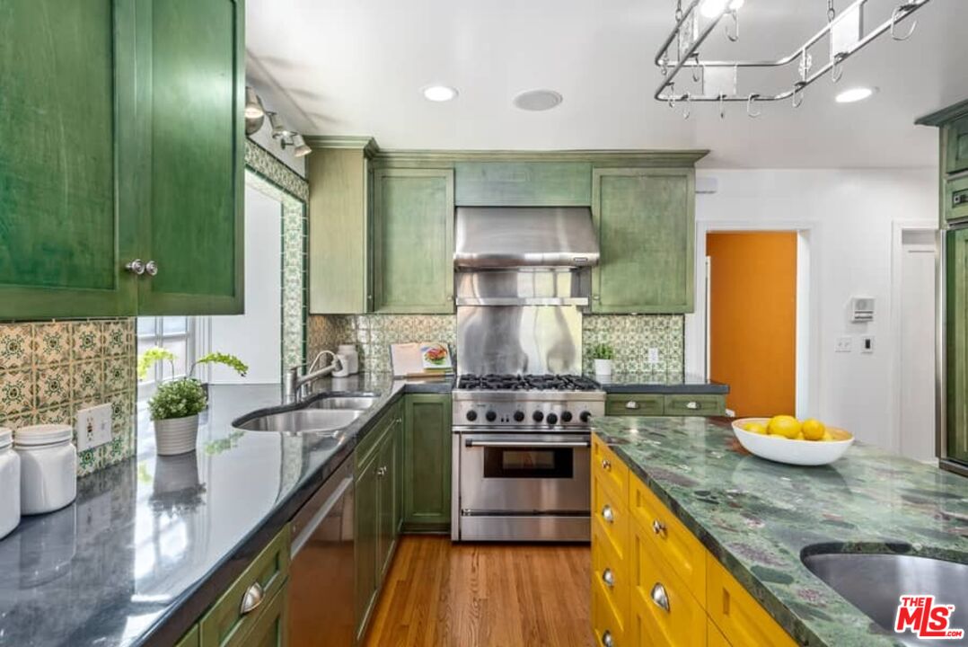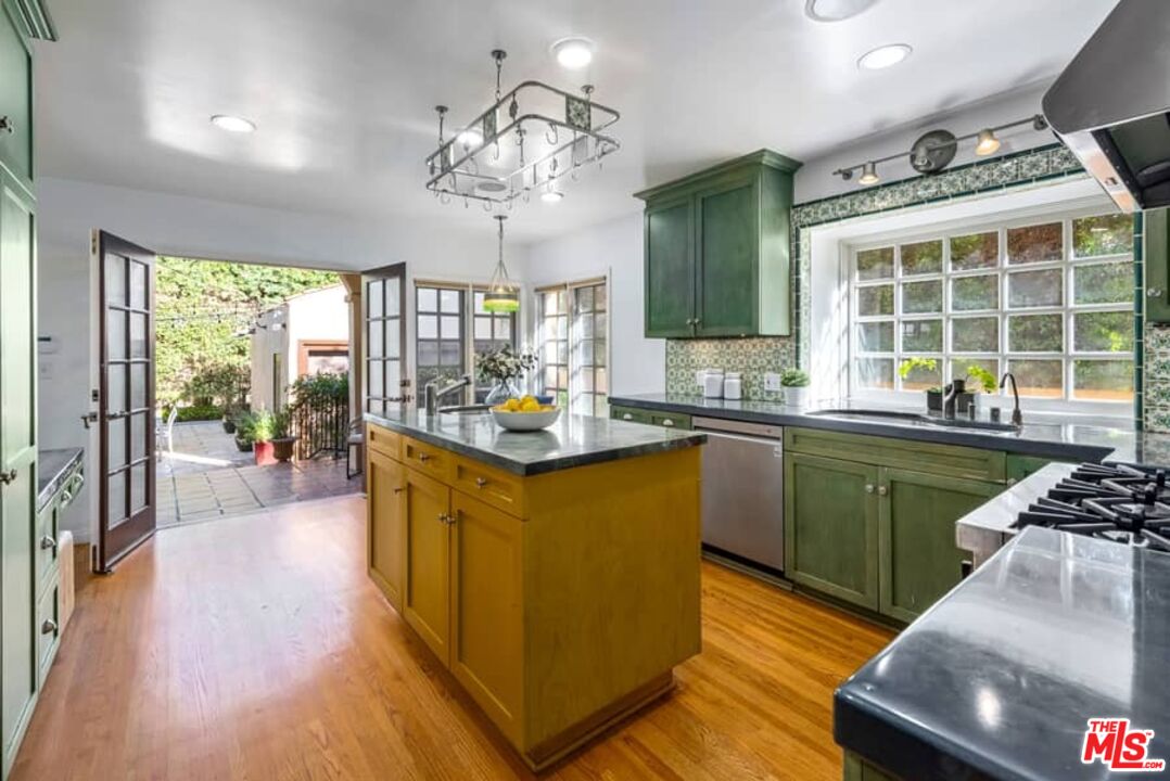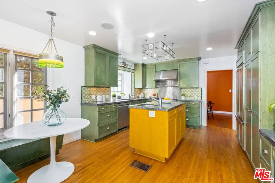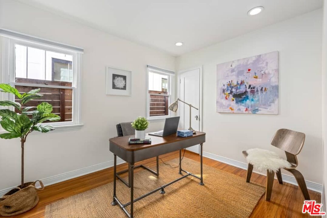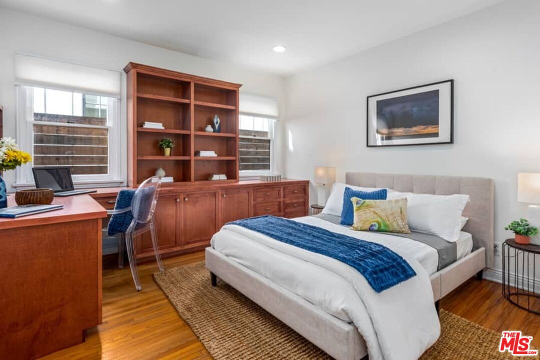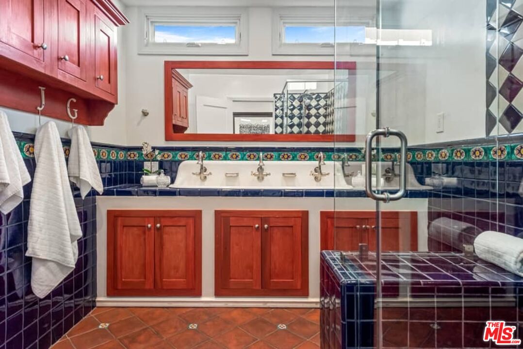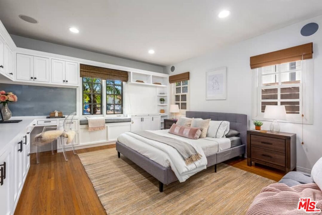 Beautifully updated Santa Barbara Courtyard 4 bed/2.75 bath 2-Story Spanish with incredible thought and detail in design and expanded floor plan, complimenting the unspoiled charm of the original character throughout. Inviting tiled front courtyard with gate opens to living room with dramatic barrel ceiling, chic wood paneled wall, fireplace with original tile design hearth, wood mantel, wall sconces and double French doors opening to front courtyard. Formal dining room with coved soffit ceiling opening to remodeled open sun-filled kitchen with stainless steel appliances including 6-burner Thermador range/oven, updated cabinetry with pantry cabinet and pull out drawers, desk workspace and breakfast nook opening to spacious family room and to the entertainer's backyard with covered back patio with archways and paver tiles to beautifully tiled backyard to create seating areas with outdoor built-in barbecue with counter covered with retractable awning, and gated driveway. 3 bed/1.75 bath downstairs, with 2 of the bedrooms including beautiful built-ins. Upstairs is the primary suite quarters with vaulted ceilings, treetop and Century City views, fireplace, 2nd laundry area, 2 custom-finished closets including a walk-in closet. Beautiful primary bath filled with natural light, dual basins, separate bath and shower and skylight. Additional features include archways, custom tiled bathrooms, hardwood floors, central ac/heat, Laundry area upstairs and downstairs, porte cochere and auto-gated driveway. Close proximity to Westwood Blvd. & Pico Blvd. restaurants and retail, Westfield Century City Mall, UCLA & Beverly Hills. Westwood Charter School.