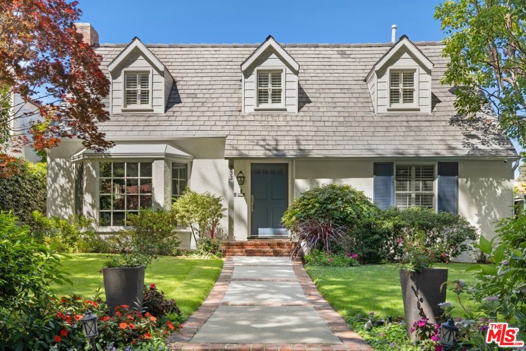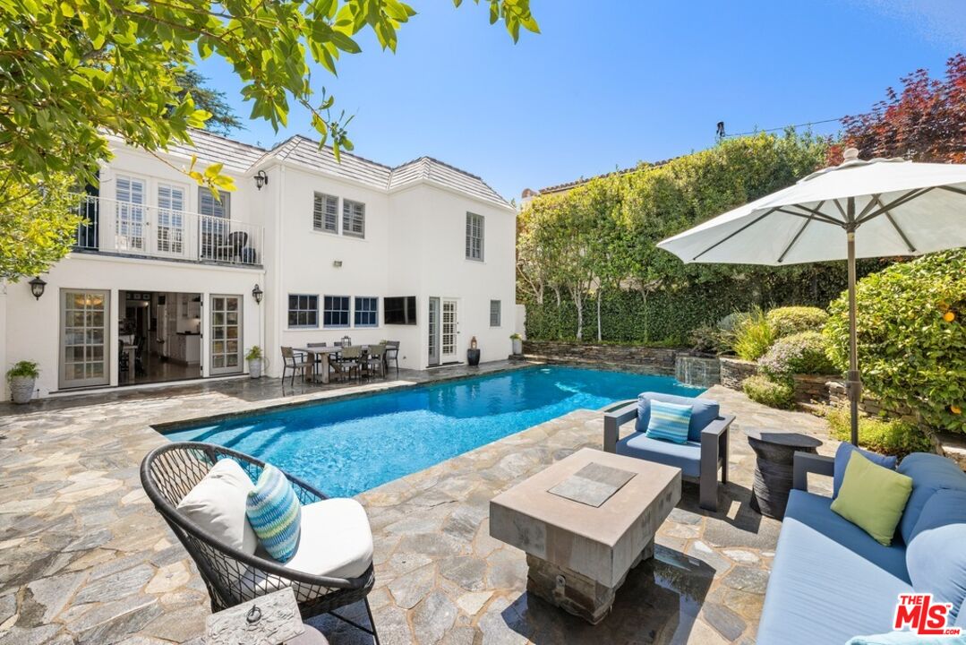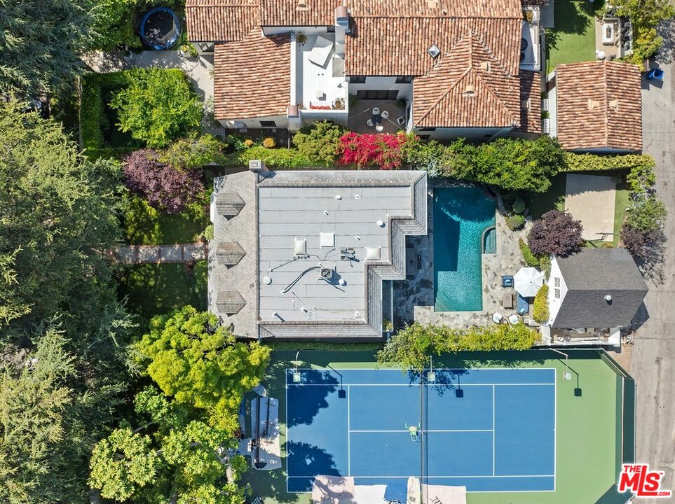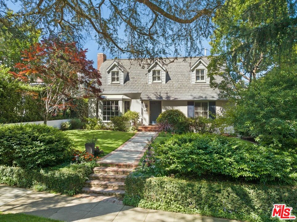 Wonderful family home on tree lined street with idyllic Santa Monica north of Montana address.Living space is 3325 square feet and features highly desirable floor plan with four bedrooms upstairs including primary suite, and large separate guest suite on main floor. Beautifully landscaped front yard welcomes you to this storybook property that blends classic California living with traditional appeal. First floor details include open floor plan with seamless flow throughout, formal living room with fireplace, chef's kitchen with top-of-the-line appliances and custom cabinetry, formal dining area, office/den, and guest powder room. French doors off kitchen open to yard with pool and spa, and separate small sport court. Upstairs features generous primary suite with balcony and primary bath with soaking tub. Three additional bedrooms, and two full baths complete the second floor. Next door, the rarely used tennis court provides this home treetop views and unobstructed southern light. Separate 2 car garage with potential for ADU in vaulted space above. This sentimental home is move-in ready with potential for personal touches in the years to come!